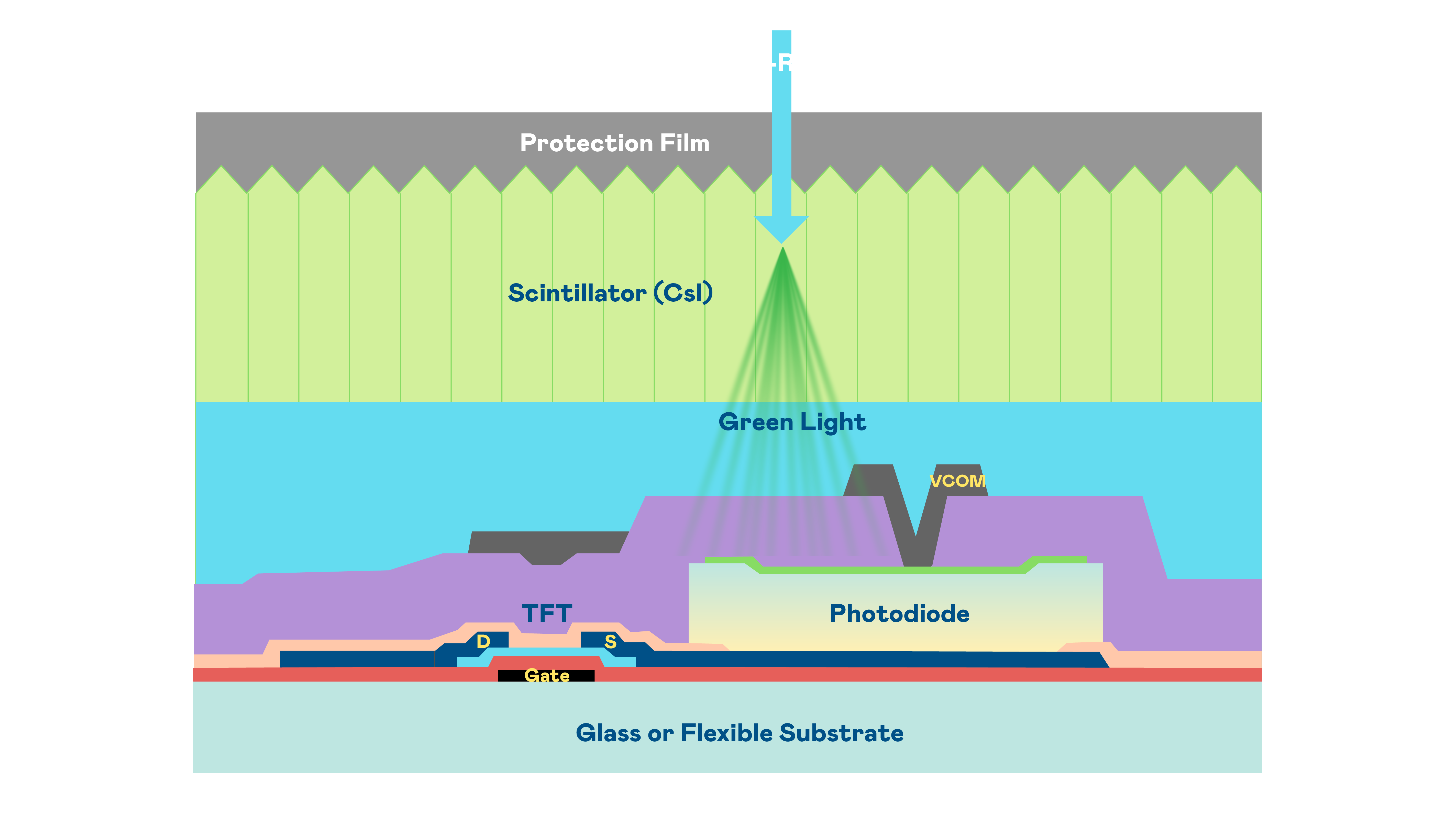 LEYU官網的X光影像感測陣列使用薄膜電晶體 (TFT) 作為每個像素的讀取開關,搭配光電二極體(Photodiode)的光電轉換元件,用以感測X光影像訊號。