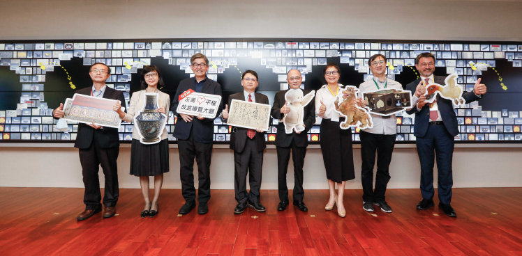 友達(dá)攜手創(chuàng)利空間為故宮建置的智慧文物互動(dòng)導(dǎo)覽牆及輪播牆,今日正式啟用 (左四:友達(dá)新事業(yè)暨投資管理總部副總經(jīng)理?xiàng)畋驹?、右四:國(guó)立故宮博物院院長(zhǎng)吳密察、右三:太極影音董事長(zhǎng)黃寶雲(yún))